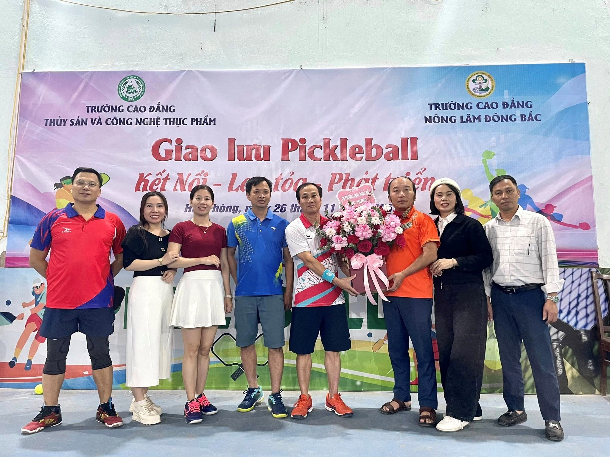 Phát biểu chào đón Đoàn, thầy Vũ An Bình – Phó Bí thư Đảng uỷ, Phó Hiệu trưởng Trường Cao đẳng Thuỷ sản và Công nghệ thực phẩm khẳng định thể thao là hoạt động quan trọng trong môi trường giáo dục toàn diện, góp phần bồi dưỡng sức khỏe, ý chí, tinh thần đoàn kết và bản lĩnh cho cán bộ, giảng viên và học viên. Hoạt động giao lưu Pickleball không chỉ là hoạt động hưởng ứng Ngày Nhà giáo Việt Nam mà còn là dịp để kết nối – lan tỏa – hợp tác phát triển giữa hai Nhà trường. Trước khi diễn ra các trận bóng giao hữu, thầy Dương Trung Hiếu- Phó Bí thư Đảng uỷ, Phó Hiệu trưởng, Chủ tịch Công đoàn Trường Cao đẳng Nông lâm Đông Bắc đã tặng lẵng hoa tươi thắm đến thầy và trò Trường Cao đẳng Thuỷ sản và Công nghệ Thực phẩm nhân dịp tháng Nhà giáo Việt Nam 20/11.