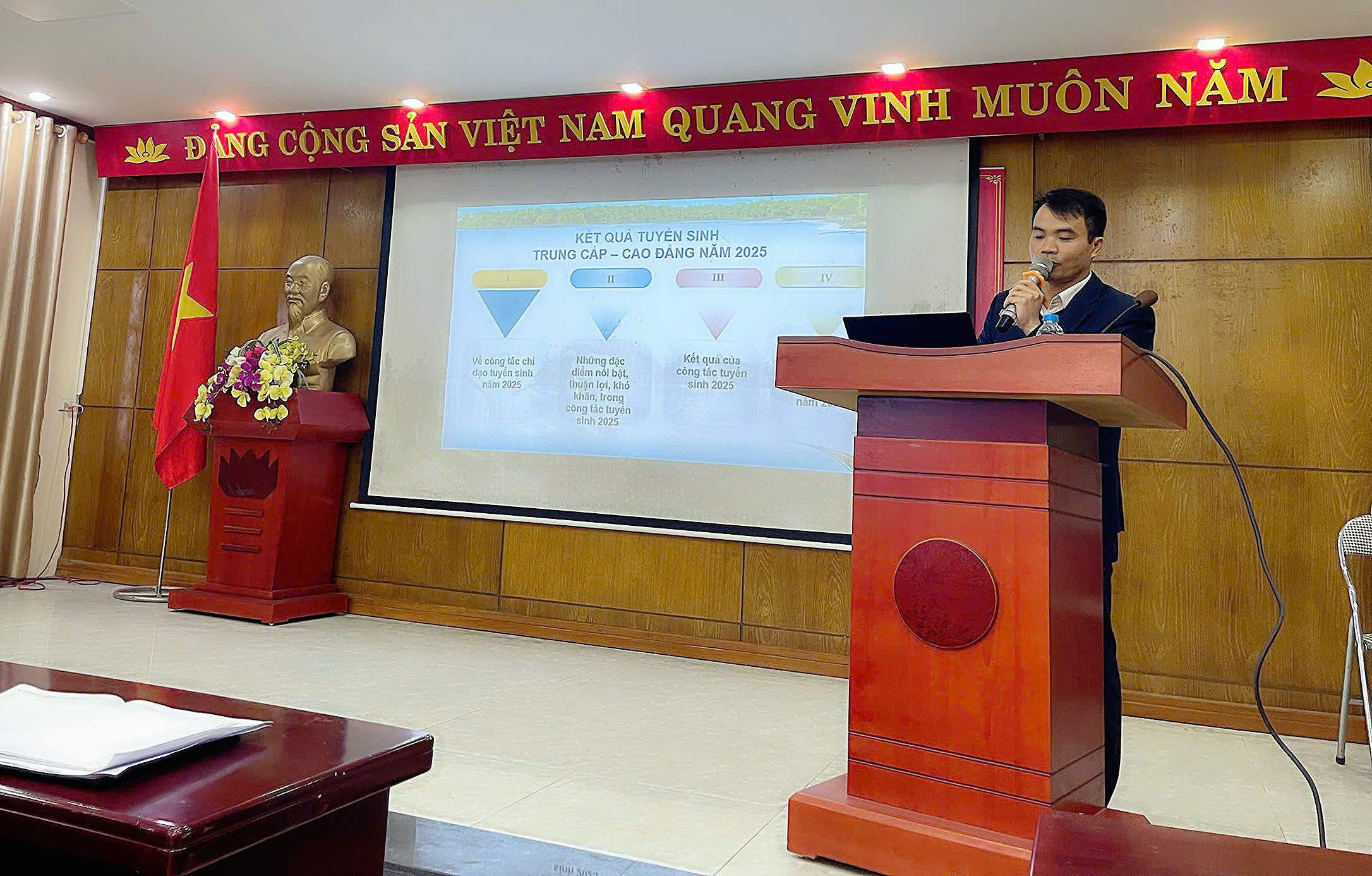 Th.s Bùi Quang Tiếp – Phó Trưởng phòng đào tạo báo cáo tổng kết công tác tuyển sinh năm 2025 và nhiệm vụ giải pháp năm 2026.