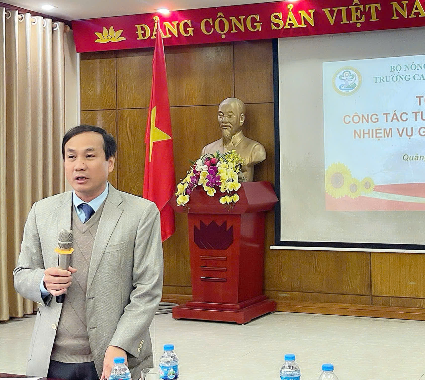 Th.s Bùi Quang Tiếp – Phó Trưởng phòng đào tạo báo cáo tổng kết công tác tuyển sinh năm 2025 và nhiệm vụ giải pháp năm 2026.